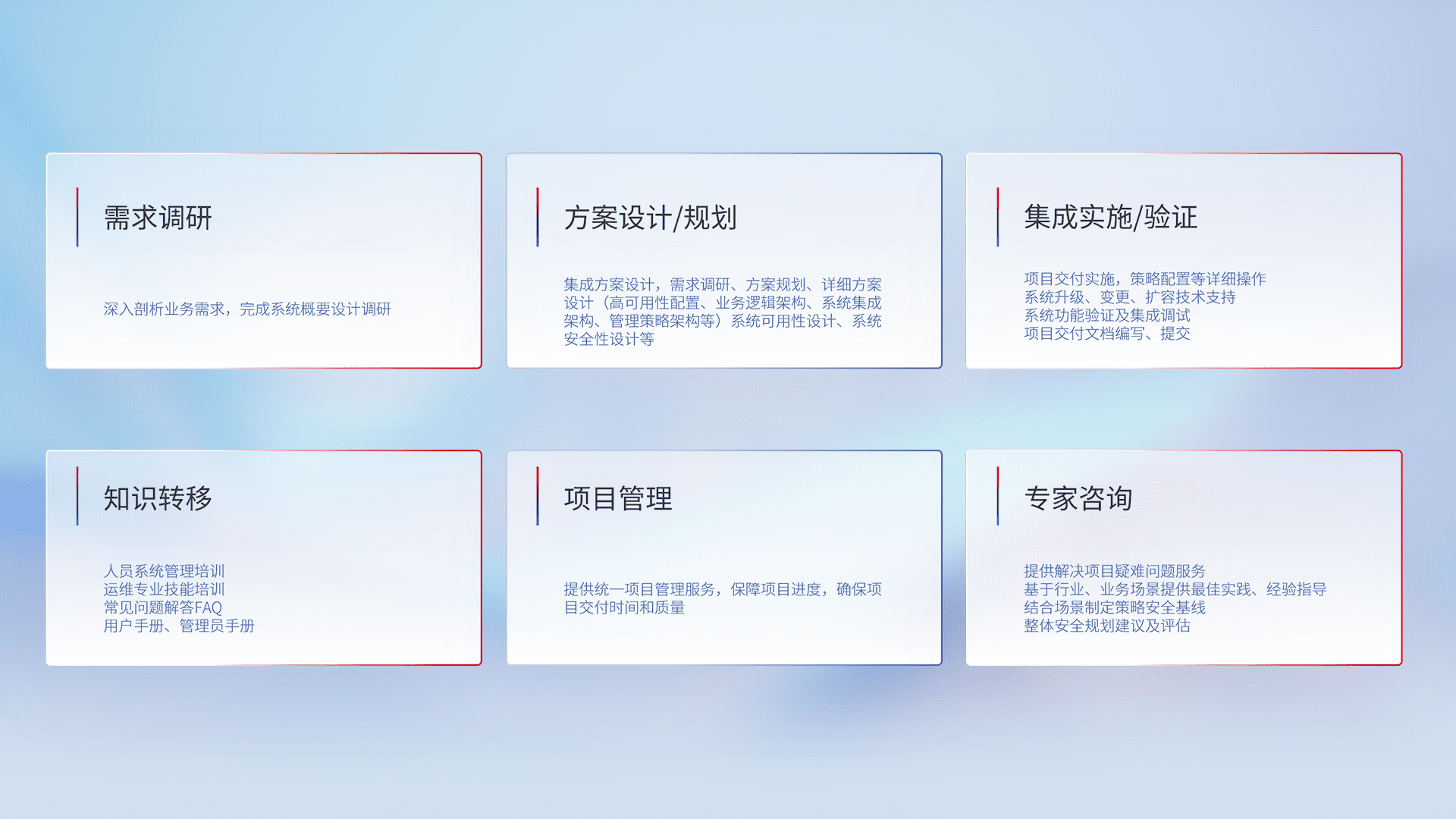 针对客户行业特性,,将宏观的安全战略和需求,,,,通过专业的交付服务,,,实现项目落地,,,,为客户提供标准规范的集成交付服务。。。。